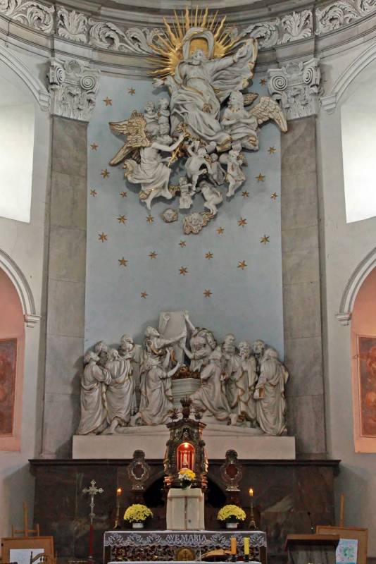 Świątynia w stylu barokowym jest orientowana. Kościół spłonął w 1807 r. Do najważniejszych jego zabytków należą polichromie z 1689 r. dzieła Karola Dankwarta, a także gotycka, dębowa rzeźba Maryi. Ołtarz główny z 1691 r., częściowo spalony w 1807 r., został uzupełniony w 1860 r. przez Bernarda Afingera. Świątynię poddano renowacji w XX w.