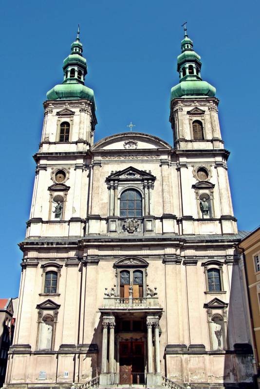 Kościół wzniesiony w latach 1688-1692, pierwotnie jezuicki, zaprojektowany był przez Andreo Quadro, a ufundowany przez biskupa wrocławskiego Karola Ferdynanda Wazę.