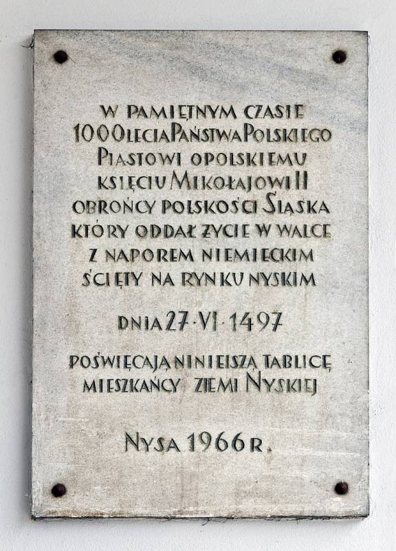 Namiestnik Śląska książę cieszyński Kazimierz II zorganizował w 1497 roku sejmik w Nysie. Tematem spotkania miały być kwestie zagrożenia Węgier ze strony Turków oraz petycja do Władysława Jagiellończyka w sprawie zatwierdzenia przywilejów dla śląskich księstw. Na zjeździe gościli również biskup wrocławski Jan IV Roth, Henryk Ziębicki oraz m.in. Mikołaj II. 26 czerwca w ratuszu doszło do tragicznych wydarzeń. Książe Mikołaj II rzucił się ze sztyletem na biskupa i cieszyńskiego piasta, który był skłócony z książętami opolskimi. Ataki były nieudane, natomiast Mikołaj schronił się w kościele św. Jakuba, gdyż chciał uniknąć odpowiedzialności. Księcia schwytano przed ołtarzem i wbrew zwyczajowi na rozkaz biskupa osadzono w lochu. Postawiono go przed sądem ławniczym w Nysie chociaż przysługiwał mu wyłącznie sąd królewski. Książę protestował, że proces jest w języku niemieckim i bezprawnie jest sądzony. Nie pomogła również próba wykupu za ogromną sumę 100000 złotych węgierskich. Został skazany na śmierć. Mikołaj w ostatnim liście uczynił swoim następcą swego brata Jana Dobrego. Wyrok sądu miejskiego wykonano niemal bezzwłocznie w celu zażegnania niebezpieczeństwa sprowadzenia z Opola odsieczy. 27 czerwca 1497 roku księcia ścięto na Rynku w Nysie. Ostatnie słowa księcia Mikołaja zostaną zapamiętane na wieki; „O Nyso! Nyso! Czyż dlatego moi przodkowie darowali ciebie Kościołowi, abyś mi teraz życie wydzierała?”. Na wieść o śmierci brata Jan Dobry chciał zorganizować wyprawę zbrojną przeciw Kazimierzowi cieszyńskiemu, ale zapobiegł temu Władysław Jagiellończyk, który nie chciał wojny domowej na Śląsku. Książę Mikołaj spoczął w mauzoleum piastowskim w kościele franciszkanów w Opolu. Na jego nagrobku wyryto napis: „Leży tutaj pogrzebany ja, który padłem wierny swym zasadom i mężnie zgiąłem kark po miecz kata. Przechodniu, powiedz dumnym władcom, że książę Mikołaj istnieje”. Po wwiezieniu zwłok księcia do Opola przez Bramę Biskupią zwaną też Mikołajską została ona zamurowana.