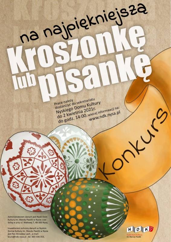 Nyski Dom Kultury zaprasza do wzięcia udziału w konkursie na “Najpiękniejszą kroszonkę lub pisankę wielkanocną”. Konkurs skierowany jest do mieszkańców powiatu nyskiego w kategorii wiekowej 30+. Pisanki można wykonać w różnych technikach tradycyjnych, jak również i tych nowoczesnych. Prace należy dostarczyć do sekretariatu Nyskiego Domu Kultury do 2 kwietnia do godz. 14:00. Więcej informacji o konkursie - kliknij link plakat konkursu