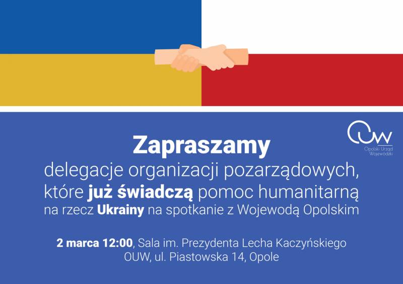 W celu usprawnienia koordynacji pomocy humanitarnej na rzecz uchodźców z Ukrainy, Wojewoda Opolski zaprasza na spotkanie delegacje (max. 2 osobowe) organizacji pozarządowych z woj. opolskiego.