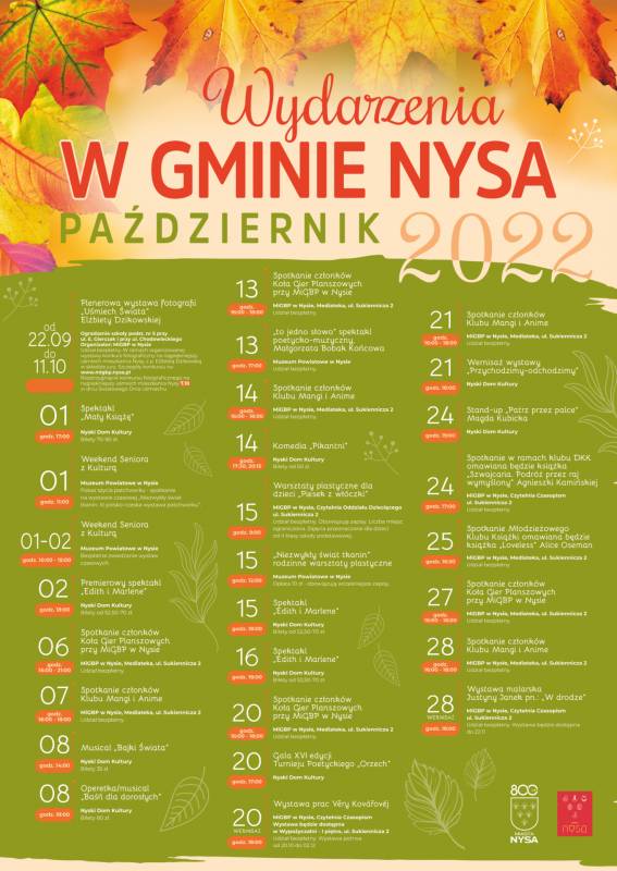 Zapraszamy do zapoznania się z kalendarzem imprez kulturalnych na październik. Warto sprawdzić co przygotowały m.in. Nyski Dom Kultury, miejska biblioteka czy Muzeum Powiatowe w Nysie. Szczegóły na plakacie - kliknij aby powiększyć.
