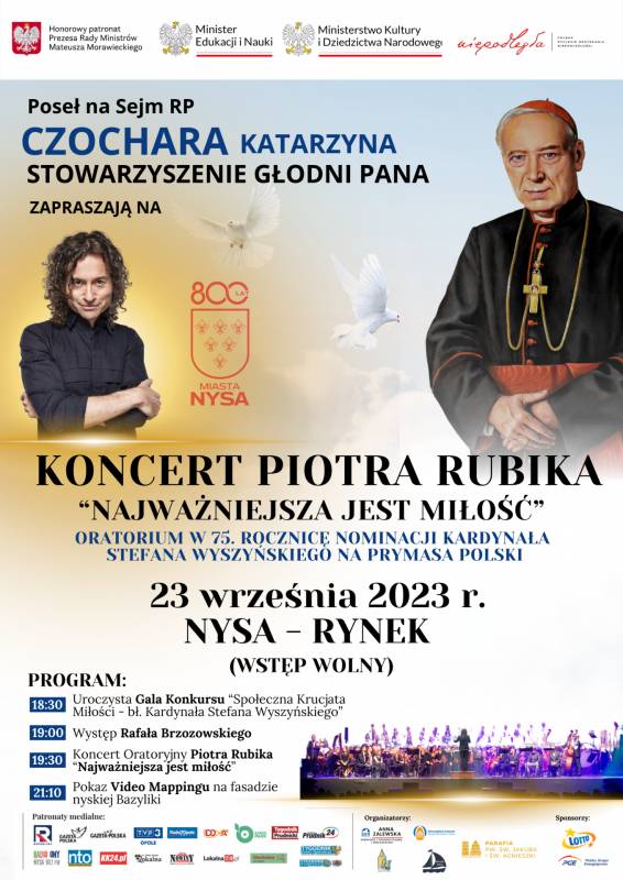 23 września na nyskim Rynku zobaczymy Oratorium w 75. rocznicę nominacji kardynała Stefana Wyszyńskiego na Prymasa Polski. Wstęp na wydarzenie jest wolny. Wydarzenie rozpocznie o godz. 18.30 Gala konkursu „Społeczna Krucjata Miłości” – bł. Kardynała Stefana Wyszyńskiego. Potem zaśpiewa Rafał Brzozowski. O 19.30 czeka nas koncert oratoryjny Piotra Rubika „Najważniejsza jest miłość”. Wszystko zwieńczy pokaz video mappingu na fasadzie nyskiej Bazyliki.