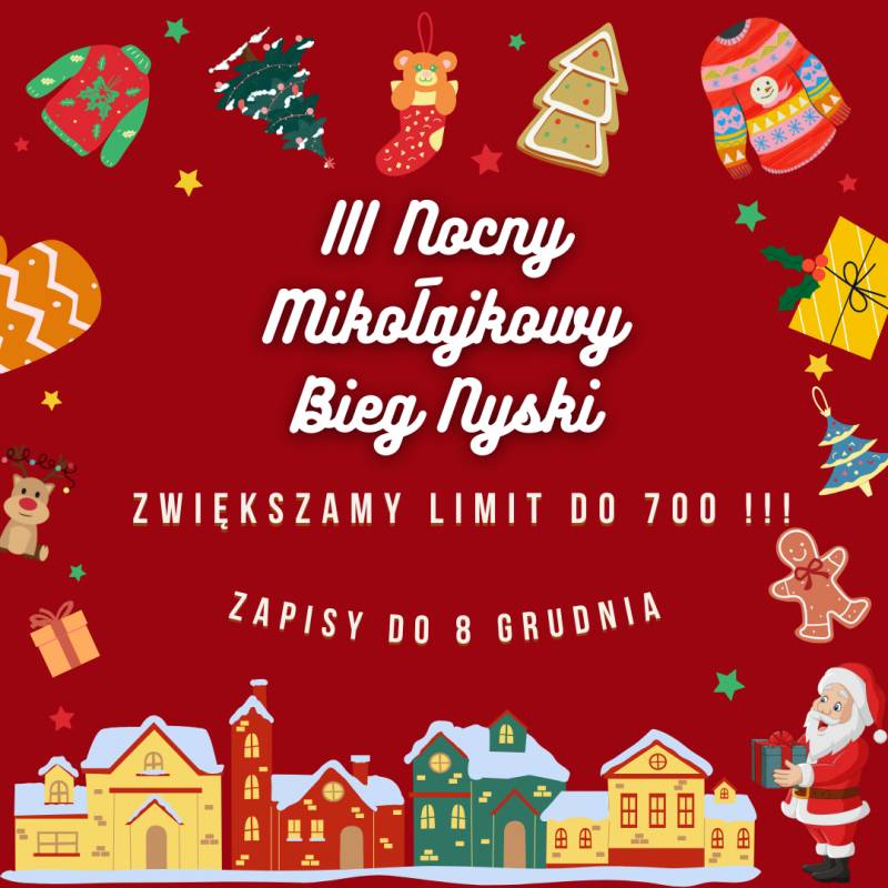 Biegacze do tego stopnia pokochali Nysę za Nocny Mikołajkowy Bieg, że organizatorzy drugi raz zwiększyli limit uczestników. Obecny limit wynosi 700 osób. Do wydarzenia pozostało 17 dni. 3. edycja Biegu Mikołajkowego odbędzie się 16 grudnia 2023 r. Uczestnicy zawodów ponownie wystartują i zakończą 5,2 kilometrową trasę w nyskim Rynku. W tym roku III Nocny Mikołajkowy Bieg Nyski pokryje się z inauguracją Jarmarku Bożonarodzeniowego. Wielka Parada Mikołajów, ruszy o godzinie 16:30, a 2,5 godziny później (19:00) biegacze w czapkach Św. Mikołaja opanują nyskie ulice. Warto dodać, że przed biegiem oraz w trakcie biegu będzie prowadzona zbiórka na rzecz 4-letniego Wojtusia Szlachetki z Nysy, który stracił wzrok i wymaga dalszej rehabilitacji. Bieg finansowany jest głównie przez firmy prywatne, co przekłada się na niskie wpisowe dla uczestników, dlatego organizatorzy biegu zachęcają do wsparcia zbiórki. Warto pamiętać, że w tym biegu liczy się przede wszystkim dobra zabawa i ma on być zachętą do regularnych treningów i zmiany stylu życia.
