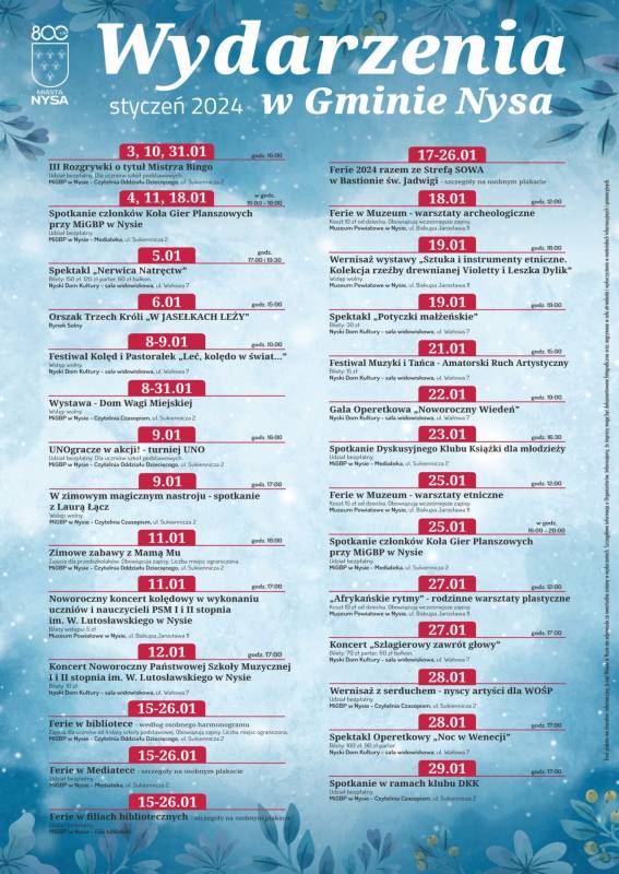 Zapraszamy do zapoznania się z kalendarzem imprez kulturalnych na styczeń. Warto sprawdzić co przygotowały m.in. Nyski Dom Kultury, miejska biblioteka czy Muzeum Powiatowe w Nysie. Szczegóły na plakacie Kliknij, by zobaczyć plakat w pełnej rozdzielczości – kliknij link