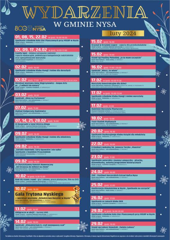 Zapraszamy do zapoznania się z kalendarzem imprez kulturalnych na luty. Warto sprawdzić co przygotowały m.in. Nyski Dom Kultury, miejska biblioteka czy Muzeum Powiatowe w Nysie. Szczegóły na plakacie Kliknij, by zobaczyć plakat w pełnej rozdzielczości – kliknij link