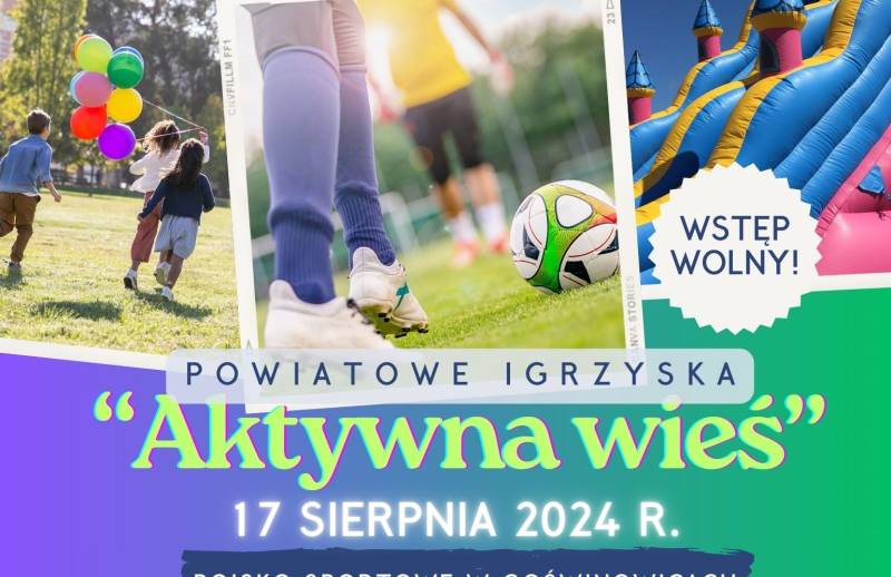 Serdecznie zapraszamy na Powiatowe Igrzyska "Aktywna Wieś", które odbędą się 17 sierpnia na Boisku Sportowym w Goświnowicach. Zabierz ze sobą rodzinę, przyjaciół i znajomych, aby wspólnie przeżywać niezapomniane chwile!