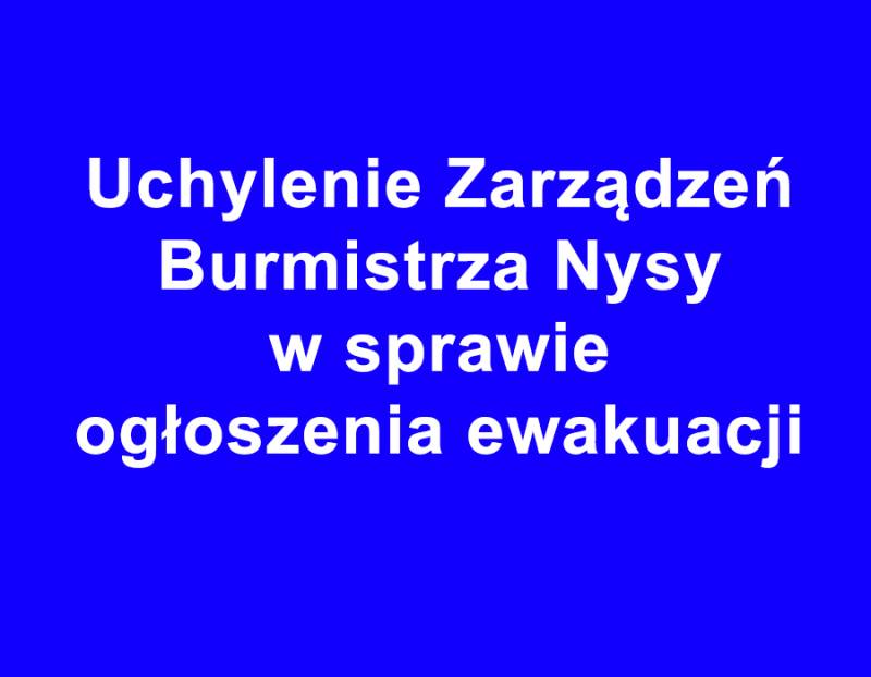 W związku z poprawą sytuacji powodziowej, obniżeniem stanu wód i usunięciem ryzyka dotyczącego zalania miasta Nysa i miejscowości ościennych, a w związku z tym zagrożenia dla zdrowia i życia mieszkańców odwołuję z dniem 21 września 2024 r. z godziną 0.00 ewakuację: 1. miejscowości Morów, którą ogłoszono Zarządzeniem Burmistrza Nysy Nr 196/2024 z dnia 13 września 2024 r. w sprawie ewakuacji na terenie części Gminy Nysa, 2. miejscowości Biała Nyska, którą ogłoszono Zarządzeniem Burmistrza Nysy Nr 197/2024 z dnia 14 września 2024 r. w sprawie ewakuacji na terenie części Gminy Nysa oraz Zarządzeniem Burmistrza Nysy Nr 200/2024 z dnia 15 września 2024 r. w sprawie ewakuacji na terenie części Gminy Nysa, 3. miejscowości Siestrzechowice, którą ogłoszono Zarządzeniem Burmistrza Nysy Nr 199/2024 z dnia 15 września 2024 r. w sprawie ewakuacji na terenie części Gminy Nysa, 4. części miasta Nysa – „Zamłynie”, którą ogłoszono Zarządzeniem Burmistrza Nysy Nr 201/2024 z dnia 16 września 2024 r. w sprawie ogłoszenia ewakuacji miasta Nysy.§2