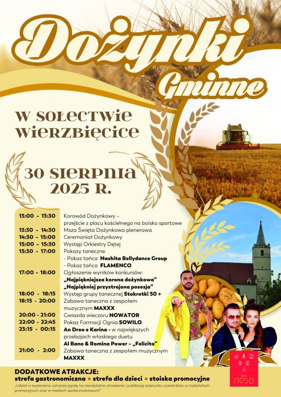 Serdecznie zapraszamy wszystkich mieszkańców i gości do udziału w Dożynkach Gminnych, które w tym roku odbędą się 30 sierpnia 2025 r. w sołectwie Wierzbięcice. To wyjątkowe wydarzenie będzie doskonałą okazją do wspólnego świętowania zakończenia żniw, integracji lokalnej społeczności oraz świetnej zabawy dla całych rodzin!