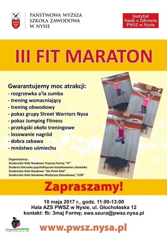 W środę 10 maja w hali AZS PWSZ w Nysie przy ul. Głuchołaskiej odbędzie się III Fit Maraton. Wydarzenie zorganizowane przez studentów nyskiej uczelni rozpocznie się o godzinie 11.