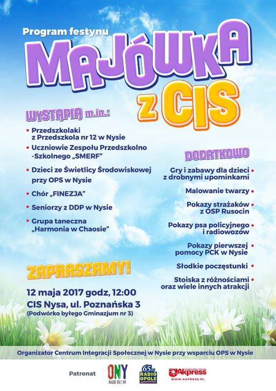 Majówka z CIS rozpocznie się o godzinie 12. Impreza ma służyć rozrywce i integracji. Swoją obecność potwierdziły delegacje z zaprzyjaźnionych CIS z Kłodzka oraz Polanowic. Pojawią się także m.in. panie z kół gospodyń wiejskich, pszczelarze czy wizażystki. Podczas imprezy na pewno każdy znajdzie coś dla siebie. Swoimi występami artystycznymi Majówkę uświetnią zarówno najmłodsi, jak i seniorzy. Wystąpią m.in. dzieci z przedszkola nr 12 w Nysie, Stowarzyszenie Przyjaciół Młodzieży "Harmonia w Chaosie", chór Finezja z Nysy i seniorzy z Dziennego Domu Pobytu w Nysie.