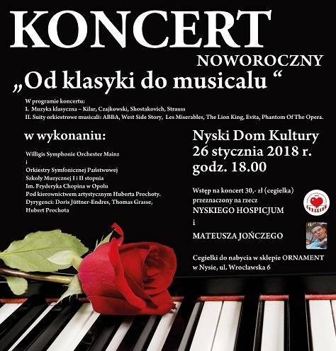 Już 26 stycznia prawdziwa gratka dla wszystkich melomanów! O godz. 18 w Nyskim Domu Kultury odbędzie się Koncert Noworoczny "Od klasyki do musicalu". Wydarzenie będzie okazją, by posłuchać znakomitej muzyki, a także wspomóc szczytny cel. Wstęp na koncert kosztuje 30 zł. Pieniądze zostaną przeznaczone na rzecz Nyskiego Hospicjum i leczenie zmagającego się z poważną wadą wzroku Mateusza Jończego.