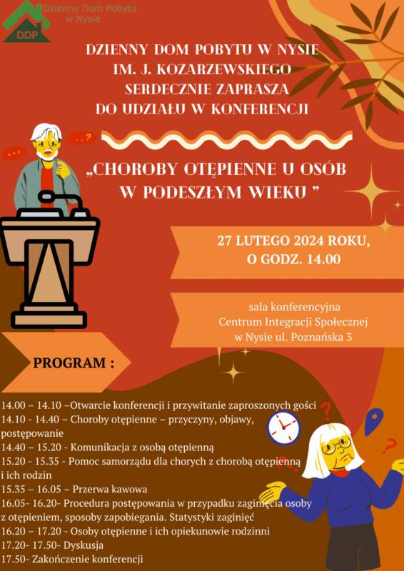 Dzienny Dom Pobyty w Nysie zaprasza do udziału w konferencji "Choroby otępienne u osób w podeszłym wieku". Wydarzenie odbędzie się 27 lutego o godz. 14.00 w sali konferencyjnej CIS na ul. Poznańskiej 3.
