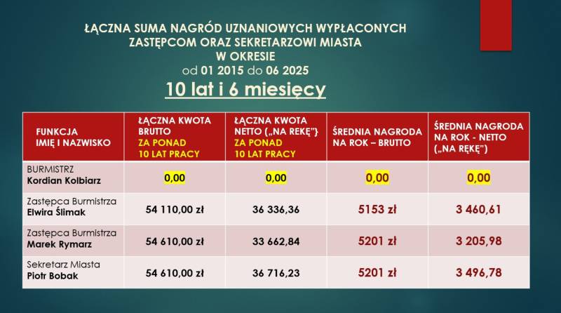 Wiceburmistrz przedstawiła dokładne kwoty wynagrodzeń Burmistrza, jego Zastępców i Sekretarza oraz wyliczyła każdą wypłaconą im na nagrody złotówkę, przez okres już ponad 10 lat. Sprostowała także szereg innych oszczerczych i krzywdzących treści pojawiających się w ostatnim czasie w mediach.