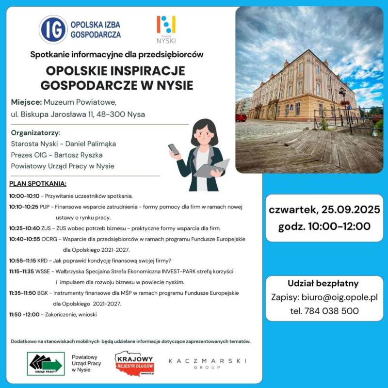 Przedsiębiorco z powiatu nyskiego – to wydarzenie jest dla Ciebie! Powiatowy Urząd Pracy w Nysie serdecznie zaprasza na spotkanie informacyjne "Opolskie Inspiracje Gospodarcze".
