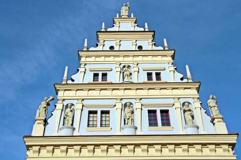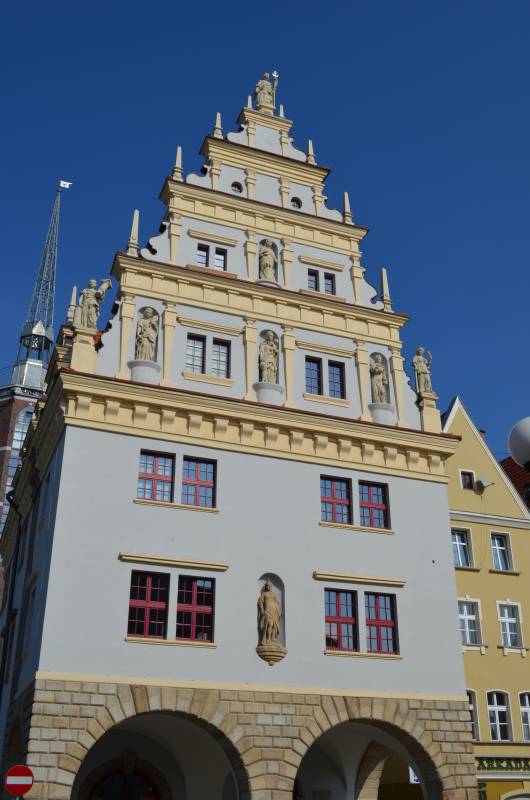 The Weigh House, founded by Bishop Jan Sitsch, was built in 1602-1604. It was the seat of the Administrative Board of the Episcopal Duchy, as well as the chamber of weights and measures. In the arcades, the official scales was placed. In 1807, the building was largely destroyed by the Napoleon’s army – a remembrance of those events is a cannonball embedded in the southern wall. The building was rebuilt in the late 19th century. In 1945, the Weigh House was destroyed again, this time by the Red Army. It was partially rebuilt in 1947. It is the Renaissance building, with a preserved fragment of polychrome and a statue of Iustitia. In 2011, the house was renovated and the statues were placed again in its niches.