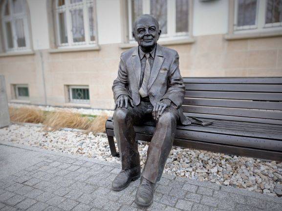 The monument in the form of a bench of Jerzy Kozarzewski was created in September 2021. Cast in bronze, it commemorates the cursed soldier in Nysa, a poet, a descendant of Cyprian Kamil Norwid. Jerzy Kozarzewski is a Warsaw insurgent, a prisoner of the Mauthausen concentration camp. The Cursed Soldier, member of the National Armed Forces and the Lizard Union. After the war, he was sentenced to death, changed into prison, thanks to Julian Tuwim's intercession. After he left, he went to Nysa, where he was the first director of a music school. He made his debut as a poet in 1992. He died in Warsaw in 1996. The author of the monument to Jerzy Kozarzewski at the municipal council in Nysa is prof. Marian Molenda.