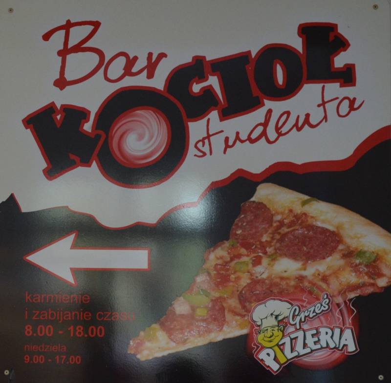 Kocioł is a perfect place to have a quick snack between the classes or a quiet dinner. In the menu,in addition to bar dishes, we will find hamburgers, pizzas sold in slices,pies or knishes. In the bar, we may organise various special events, banquets or conferences.